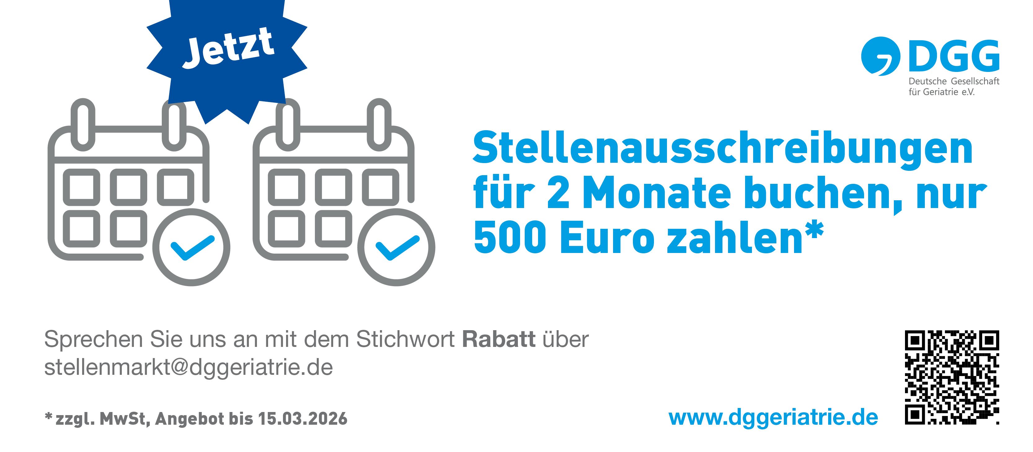 Die Website der DGG ist populäre Anlaufstelle für Geriater. Der integrierte Stellenmarkt reflektiert die Vitalität des Berufsfeldes – und ermöglicht es Akutkliniken, Krankenhäusern und Rehakliniken, schnell geeignetes Personal zu finden. Unter www.dggeriatrie.de informieren sich leitende Ärztinnen und -ärzte, Oberärztinnen und Chefärzte mit und ohne Zusatzweiterbildung Geriatrie sowie geriatrisch interessierte Assistenzärzte, Internistinnen, Allgemeinmediziner, Neurologinnen und weitere Fachärzte, Studierende, Medizin-Personalagenturen und nicht zuletzt Medizin-Journalistinnen. Auf der Website der Fachgesellschaft für Geriatrie finden alle, was sie suchen: Informationen rund um das Fachgebiet, Jobangebote, Weiterbildungsangebote sowie Fortbildungshinweise. Die Kandidaten erfahren auf verschiedenen Wegen von Ihrer Stellenanzeige. Unser Ziel ist es, die Kandidaten dort abzuholen, wo sie sich aufhalten und dann zum Stellenmarkt bzw. Ihrer Anzeige zu bringen.