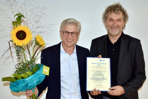 (04.10.2023) Förderungswürdige Leistungen des wissenschaftlichen Nachwuchses: Im Rahmen des Jahreskongresses der Deutschen Gesellschaft für Geriatrie (DGG) in Frankfurt am Main wurden jetzt die drei besten Posterpräsentationen sowie der beste freie Beitrag ausgezeichnet – mit einem Preisgeld über jeweils 300 Euro. Unser Bild zeigt Dr. Alexander Gerhard (li.) aus Arnsberg bei der Preisverleihung zum besten Beitrag. Seine Arbeit mit dem Titel „Modifizierung von Mikroglia-Aktivierung als Behandlungsansatz der frühen Alzheimer-Erkrankung“ hat er zusammen mit Professor Andreas H. Jacobs eingereicht. „Ein wirklich sehr guter Beitrag mit relevanten Ansätzen in der Alzheimer-Forschung“, lobt DGG-Präsident Professor Markus Gosch (re.) die Siegerarbeit bei der Preisverleihung.