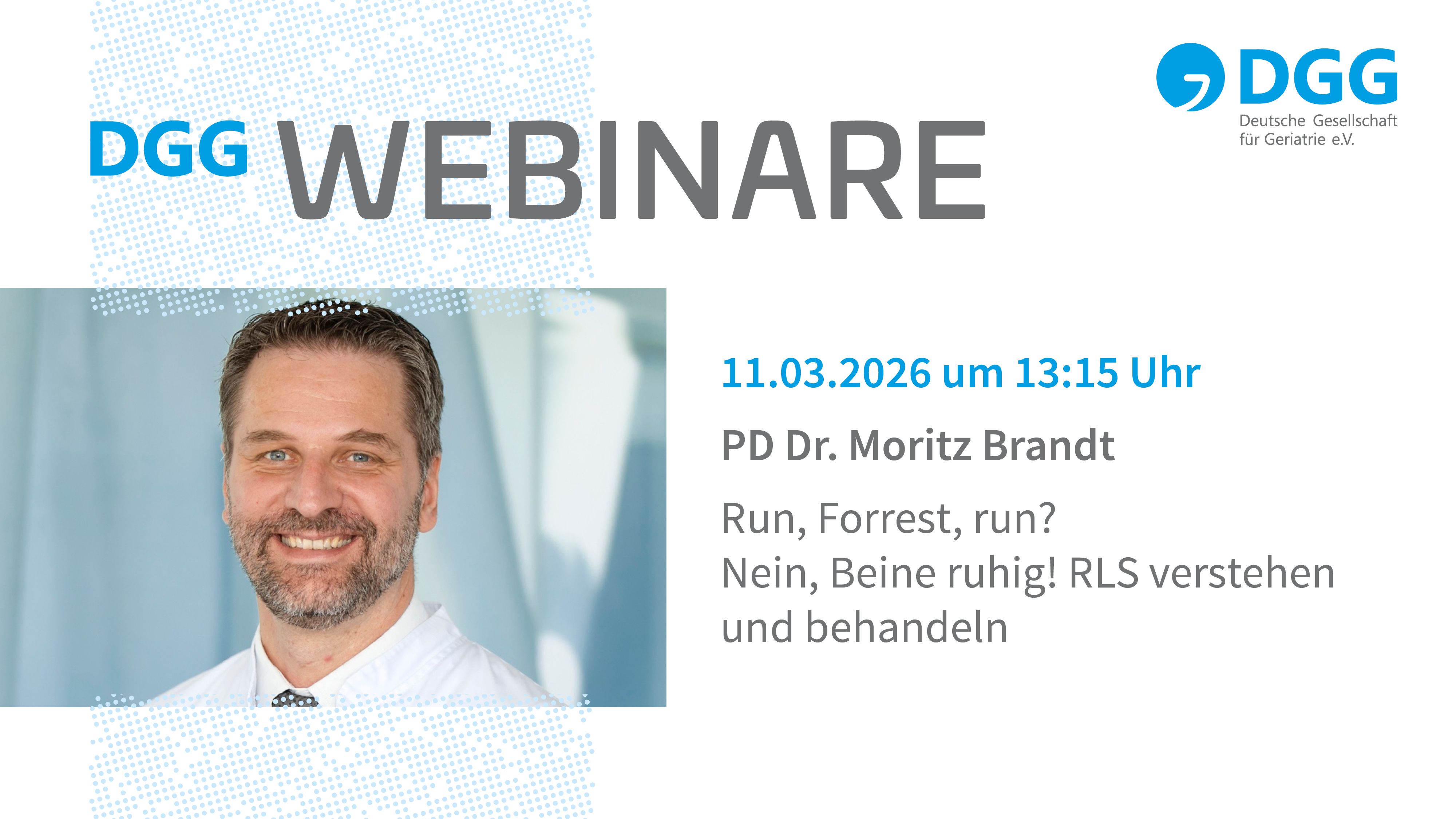 Jetzt schon vormerken: am Mittwoch startet um 13:15 Uhr das DGG-Webinar im März. PD Dr. Moritz Brandt referiert zum Thema Run, Forrest, run? Nein, Beine ruhig! RLS verstehen und behandeln.