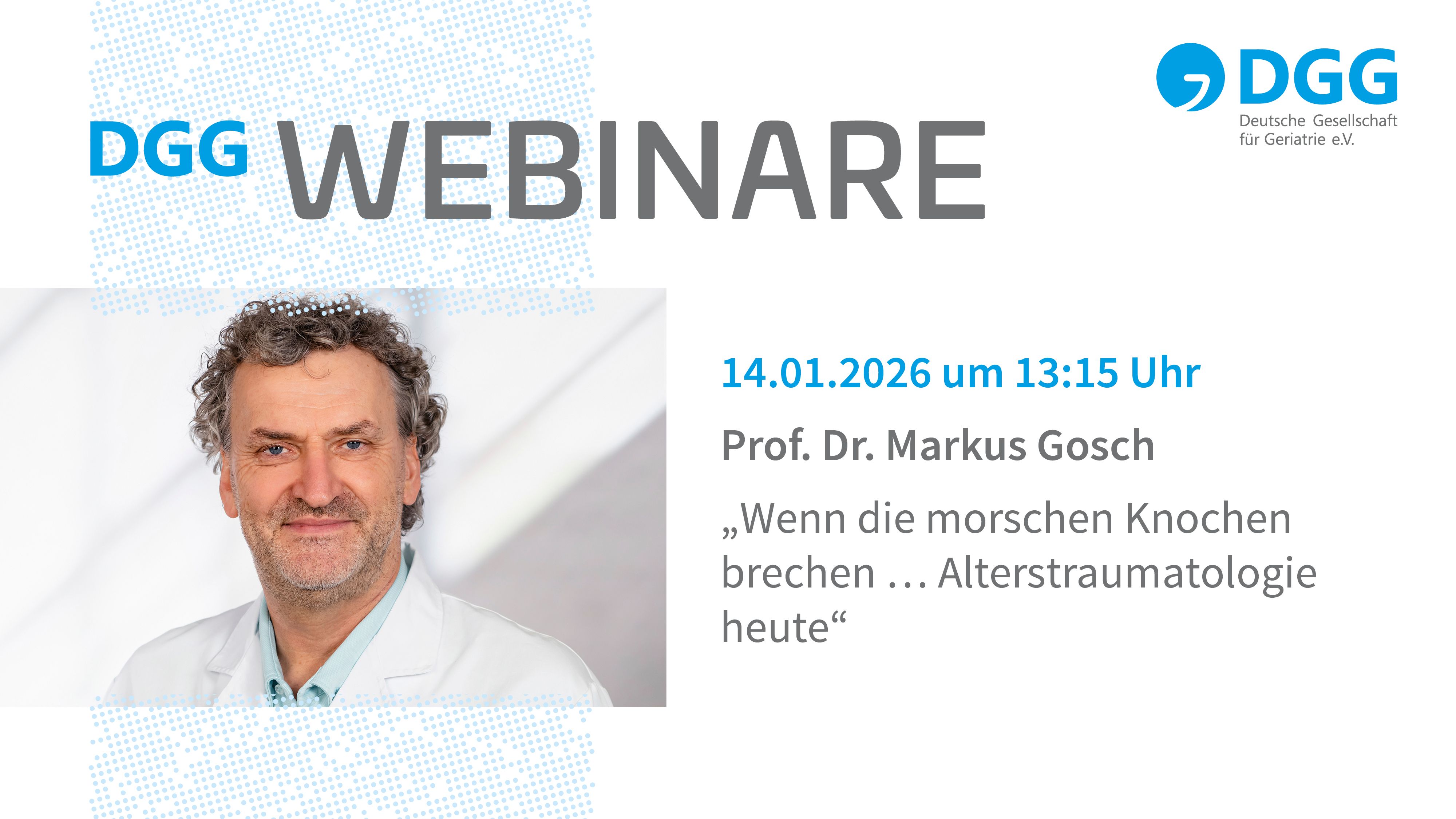 Jetzt schon vormerken: am Mittwoch startet um 13:15 Uhr das DGG-Webinar im Januar. Prof. Dr. Markus Gosch referiert zum Thema „Wenn die morschen Knochen brechen … Alterstraumatologie heute.