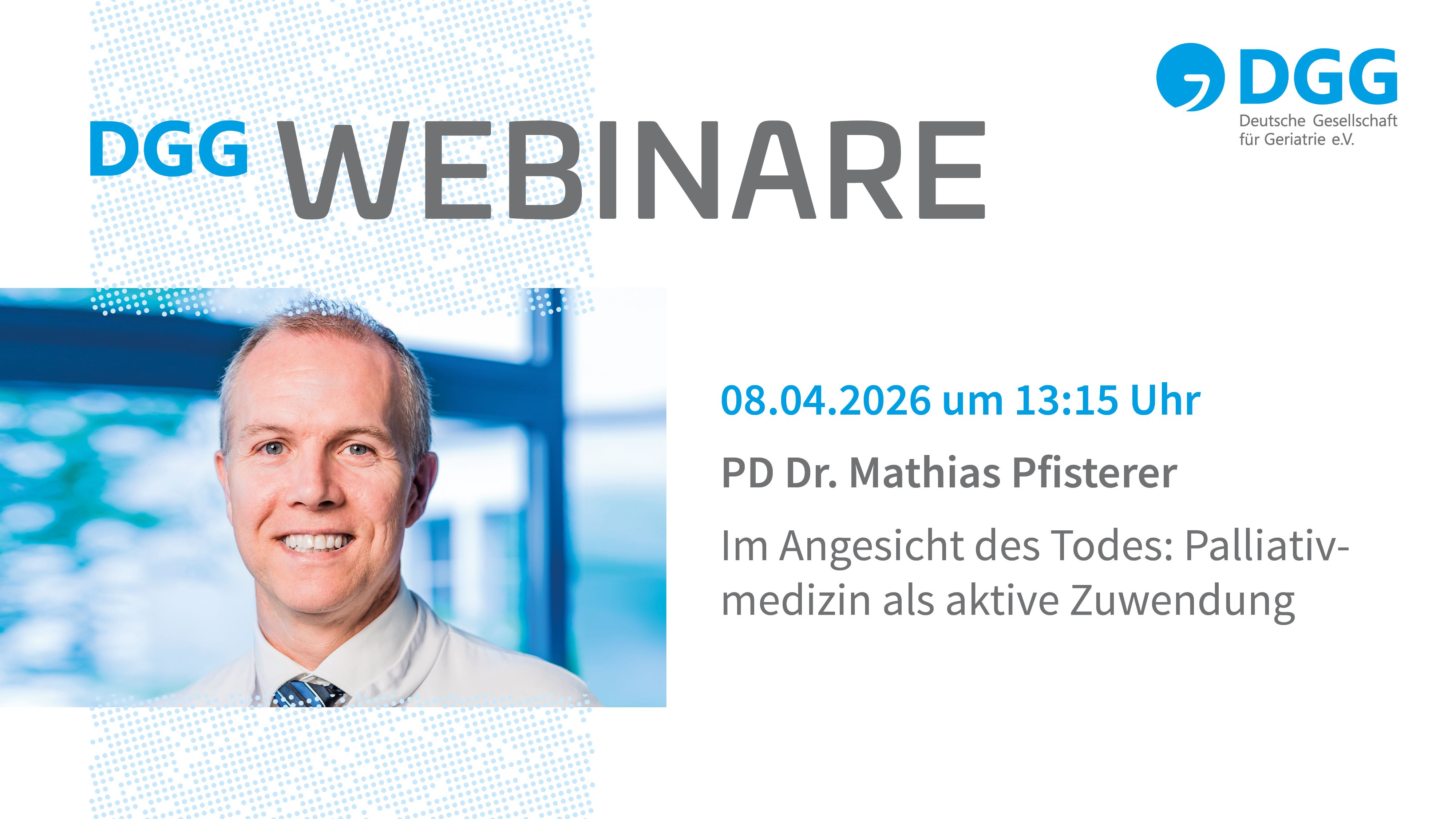 Jetzt schon vormerken: am Mittwoch startet um 13:15 Uhr das DGG-Webinar im April. PD Dr. Mathias Pfisterer referiert zum Thema Im Angesicht des Todes: Palliativmedizin als aktive Zuwendung.